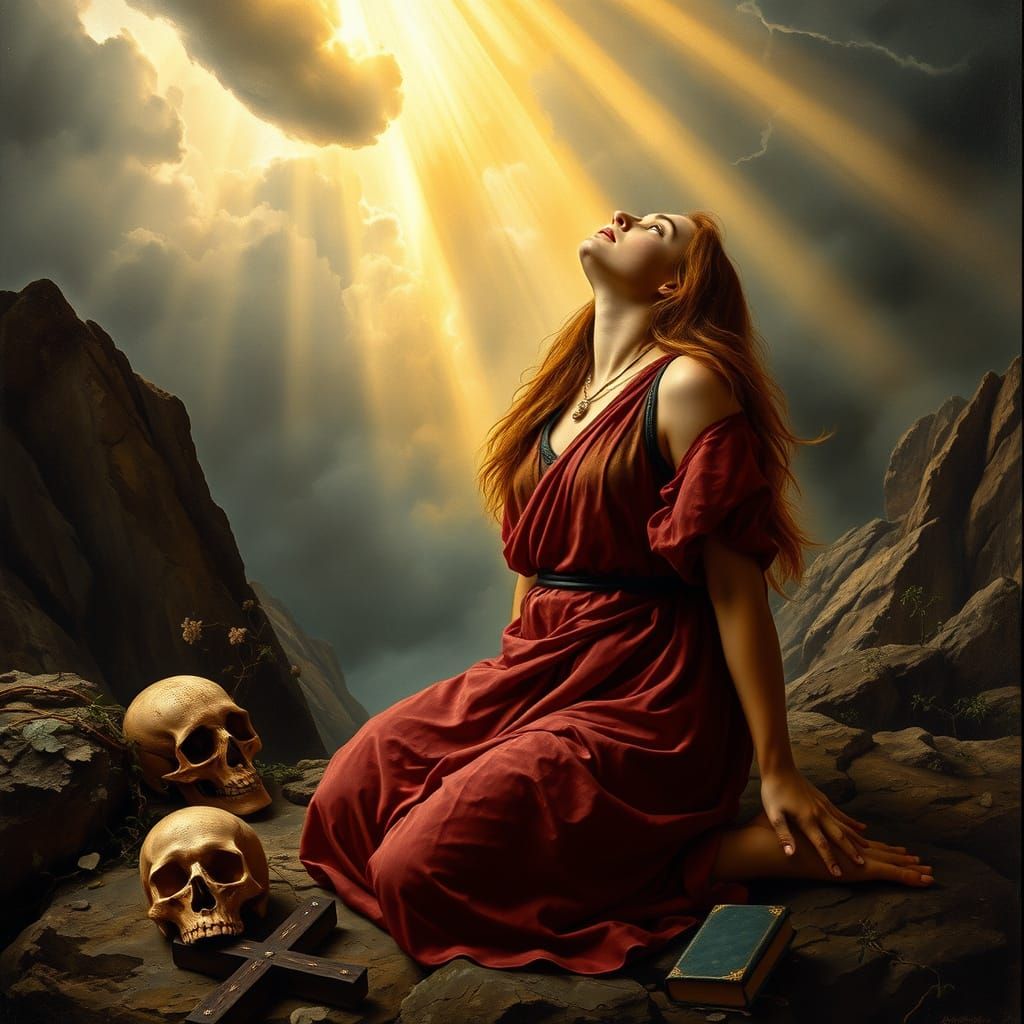 This image shows a poignant scene of Mary Magdalene in a rugged, rocky wilderness, bathed in divine light and surrounded by symbols of contemplation. Her elegant, flowing attire and auburn hair convey a sense of quiet sensuality and spiritual longing, set against a turbulent stormy sky.