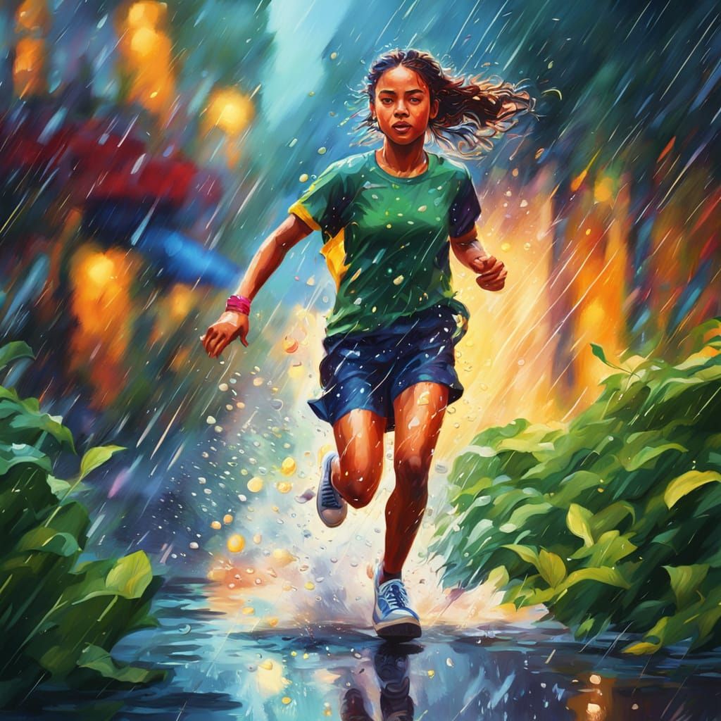 A vibrant oil painting of a girl running in the summer rain. This close-up concept art shows dynamic triadic colors, warm golden lighting, and water splashing around her feet.