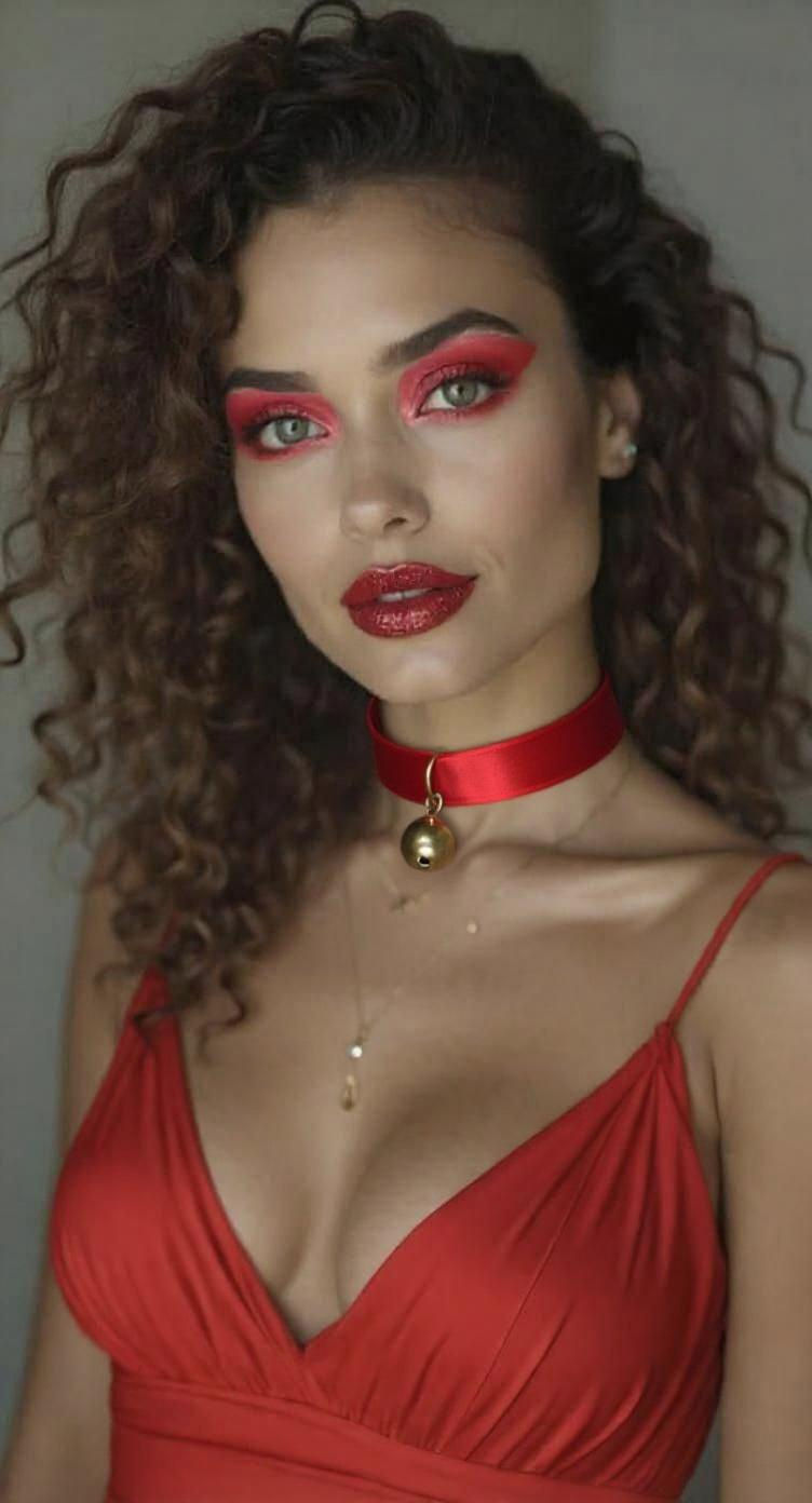 This image shows a beautiful woman with green eyes and tanned skin, her curly hair framing her face. She wears a white Greek goddess dress with a plunging neckline.