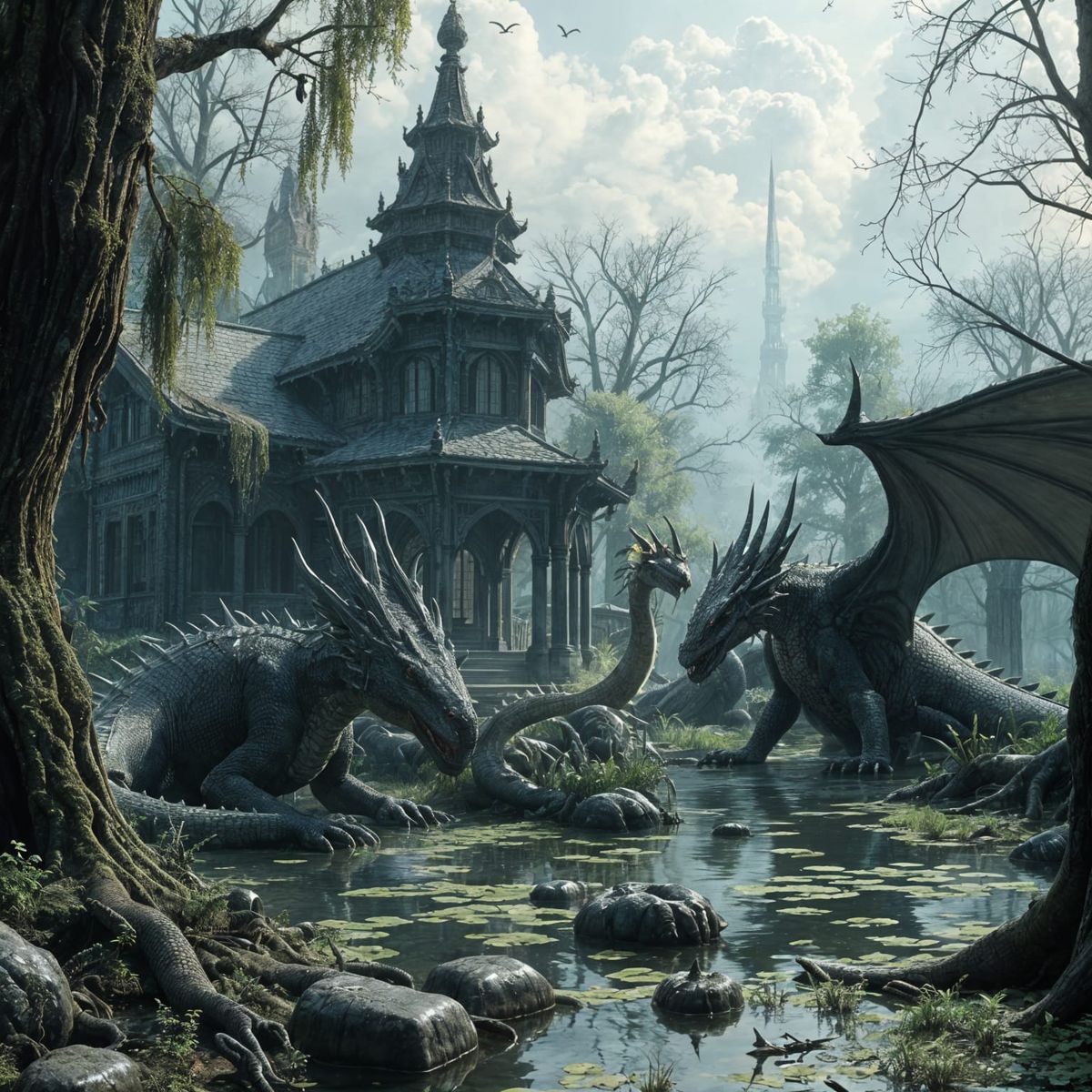 This image shows a retirement sanctuary for swamp dragons. The dragons are resting in a swampy environment, depicted with cinematic, detailed, and atmospheric digital painting techniques.