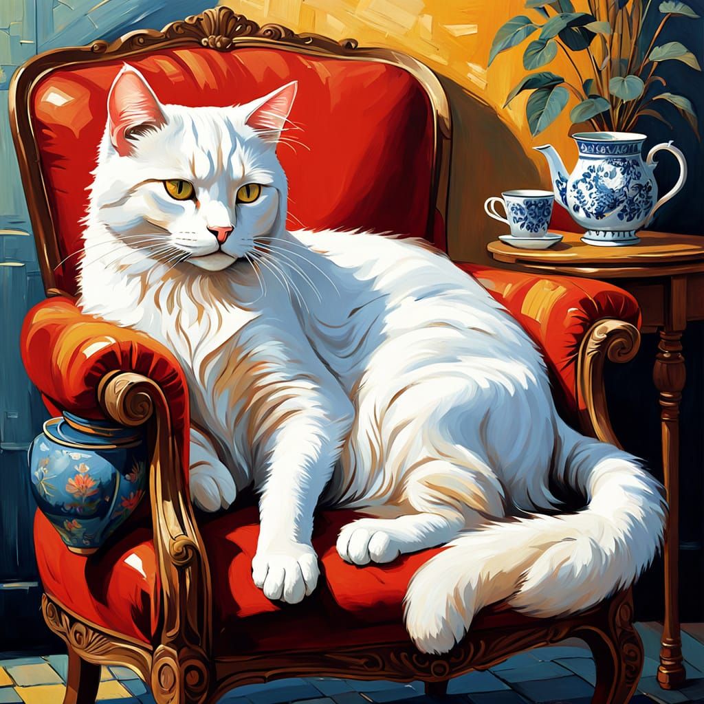 A neo-impressionist painting shows a cat sleeping on a red armchair. The oil painting uses impasto techniques, thick paint layers and soft golden lighting to create a serene atmosphere.