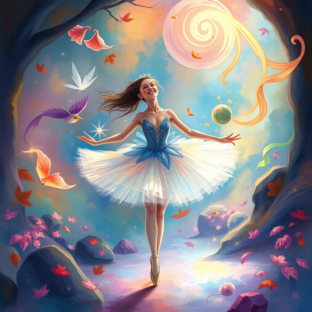 This enchanting image captures a delicate ballerina amidst a kaleidoscope of swirling colors and soft, ethereal light, reminiscent of a watercolor painting with feathery brushstrokes and shimmering accents.