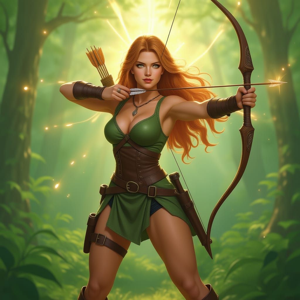 This image depicts Artemis, the Greek goddess of the hunt, as a tall, nimble woman with golden hair, bow, and arrows, standing in a forest setting.