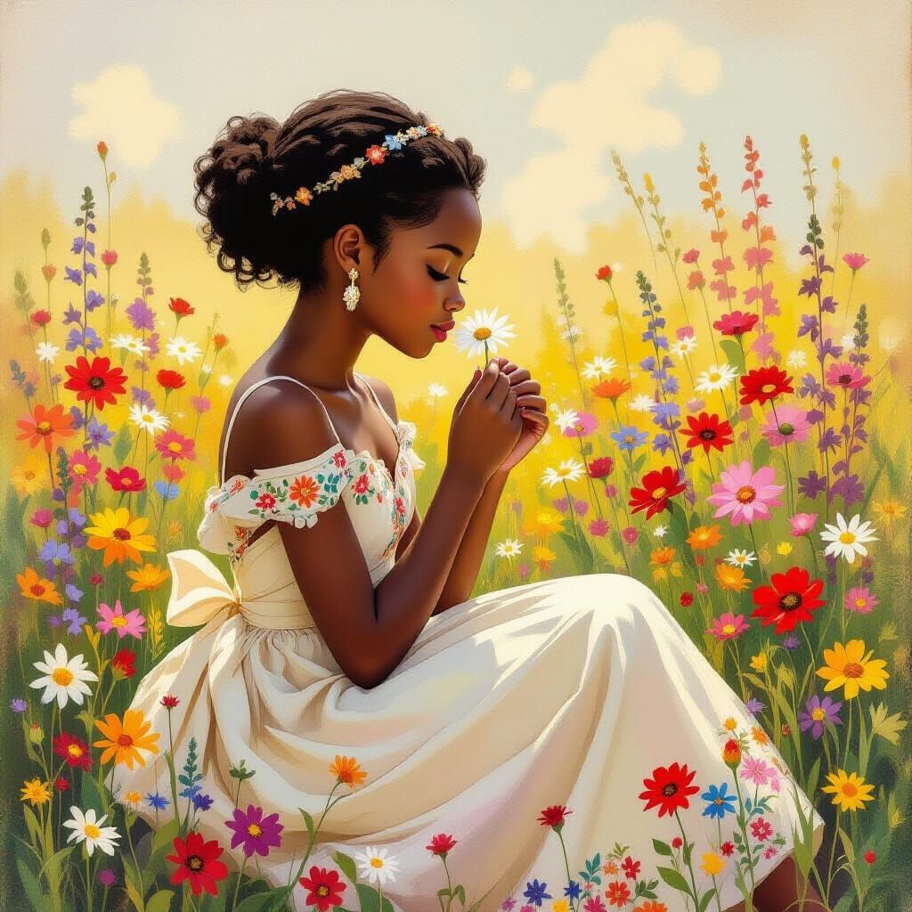 A portrait of a young Black girl in an embroidered dress, smelling a daisy in a flower field. The image is rendered with warm, soft brushstrokes reminiscent of impressionism.