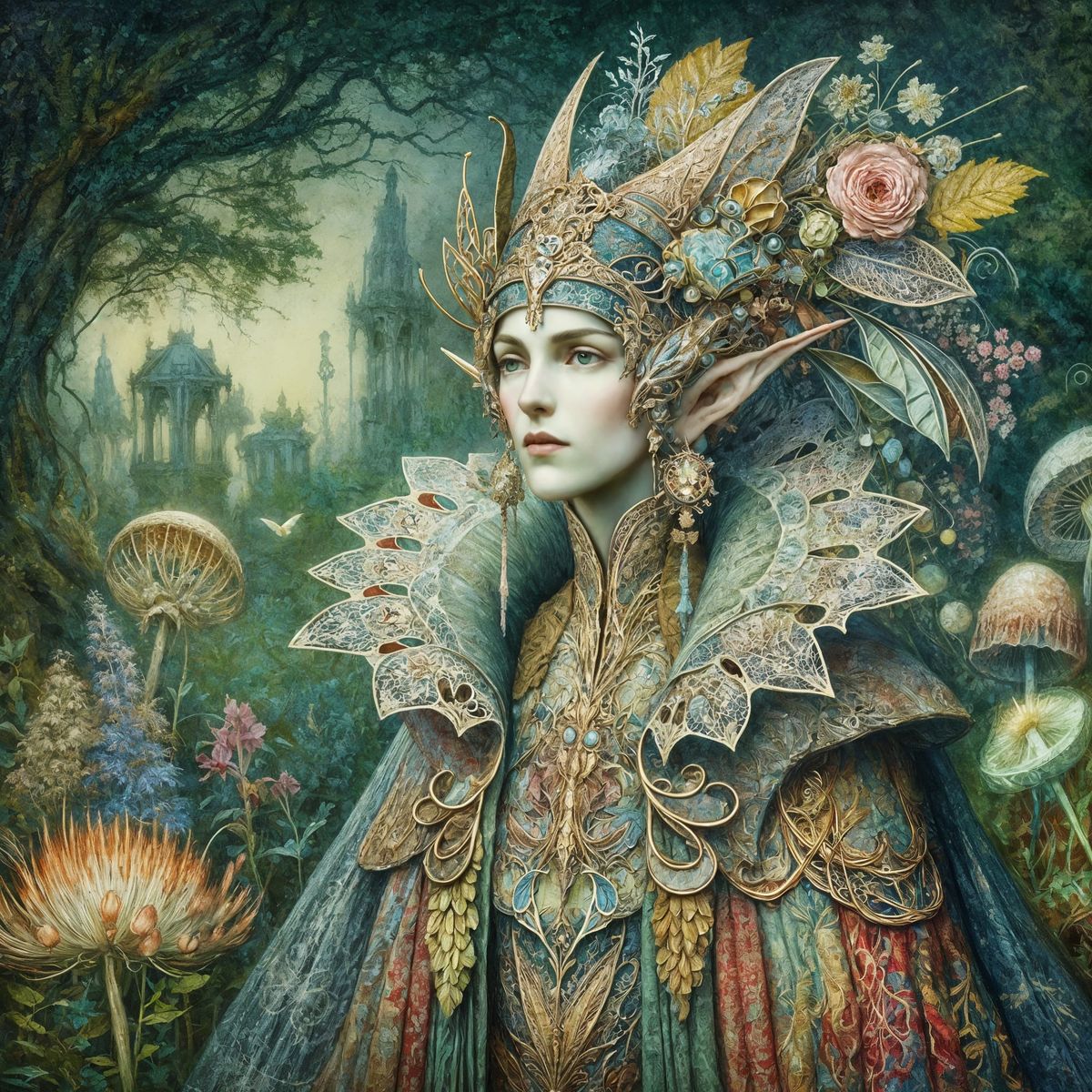 This image depicts an elegant elf in a magical, overgrown garden bathed in twilight and a supernatural glow. The style evokes pre-Raphaelite masters with ornate, brightly colored costumes and painterly techniques.