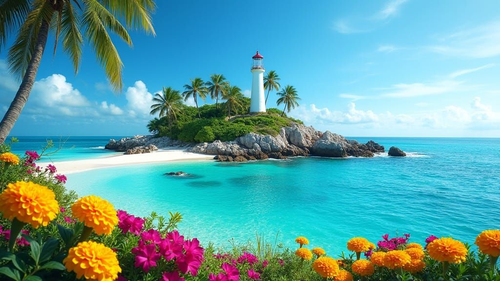 A breathtaking tropical island scene featuring a majestic white lighthouse, lush green vegetation, and vibrant flowers set against a brilliant blue sky with wispy clouds and crystal-clear turquoise waters
