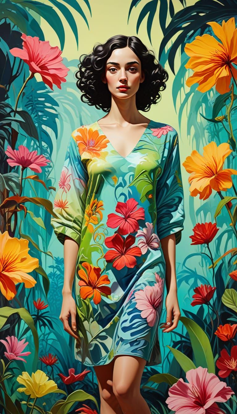 A vibrant image of Venus in a lush tropical garden. The artwork employs bold colors and loose brushwork, reminiscent of fauvism, with surreal elements in a melting oil on canvas style.