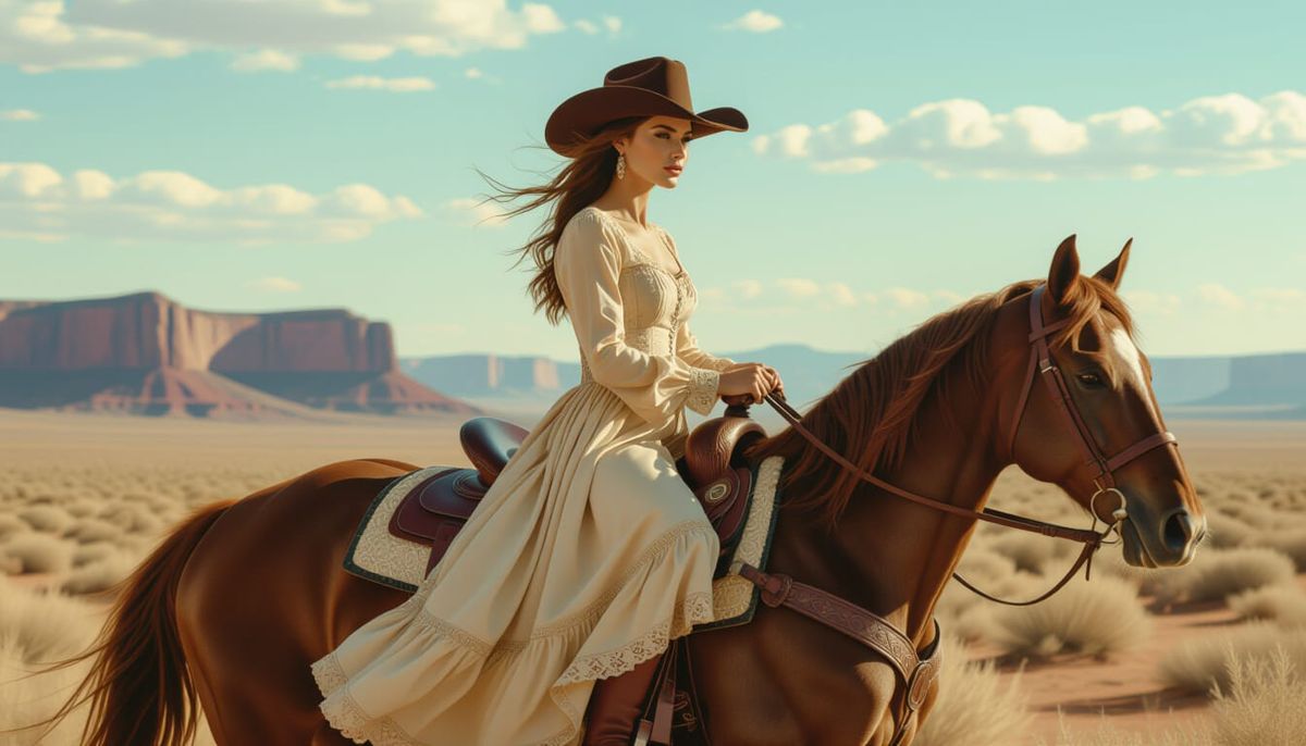 This image shows a cowgirl on horseback in a desert scene. The photorealistic image showcases textures and atmospheric lighting, reminiscent of large-scale landscape photography.