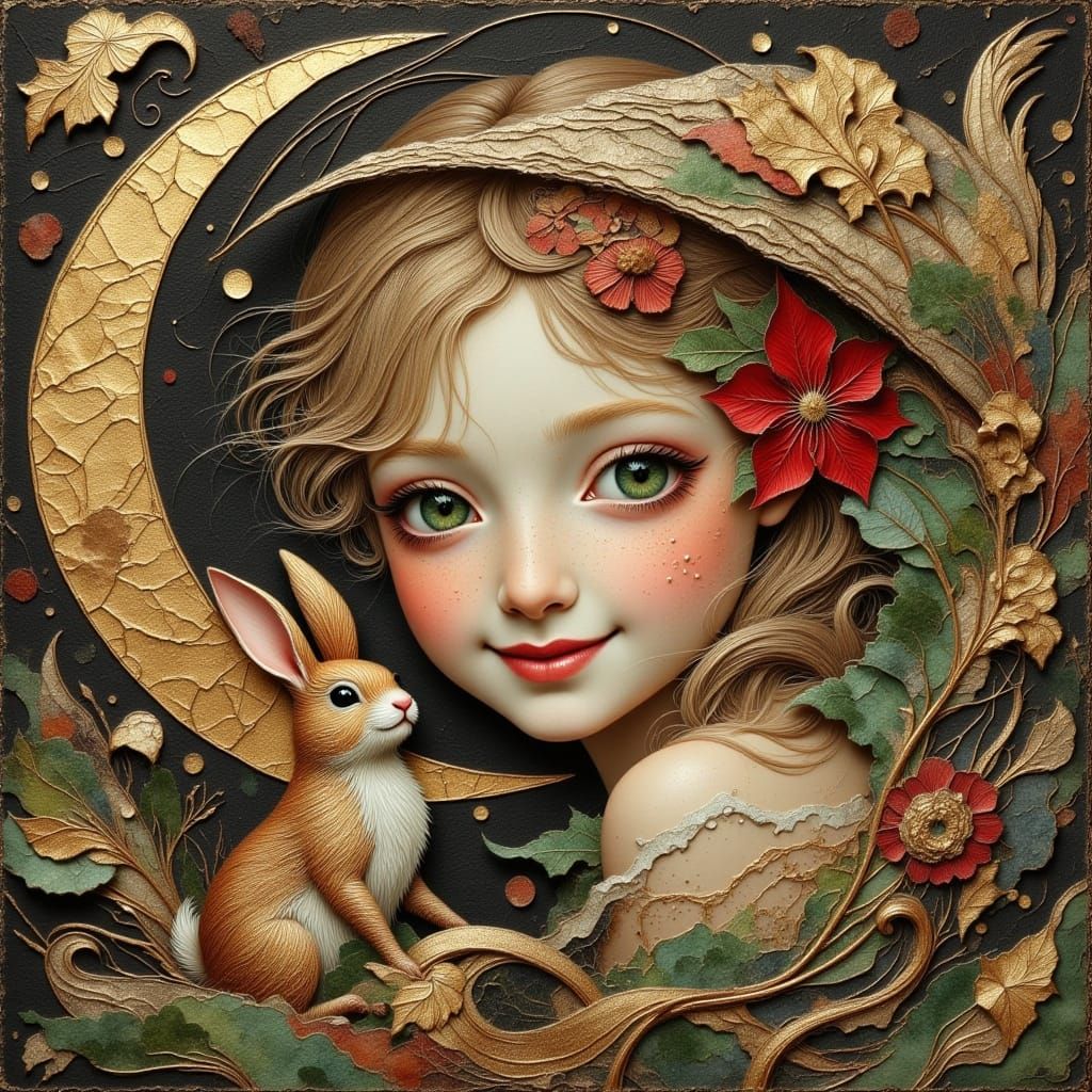 This image shows a happy, smiling blonde girl child with a baby rabbit, rendered in a bold fantasy oil painting style with rich texture and vibrant colors. Features surrealist influences and impossible shapes.