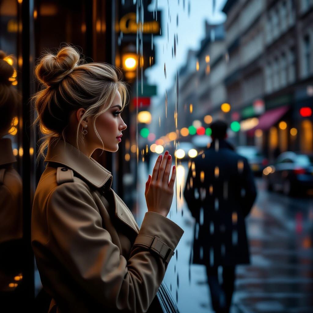This photorealistic image shows a woman in a trench coat at a vintage cafe window, watching a man's silhouette in the rain. Cinematic framing and golden hour light create a contemplative mood.