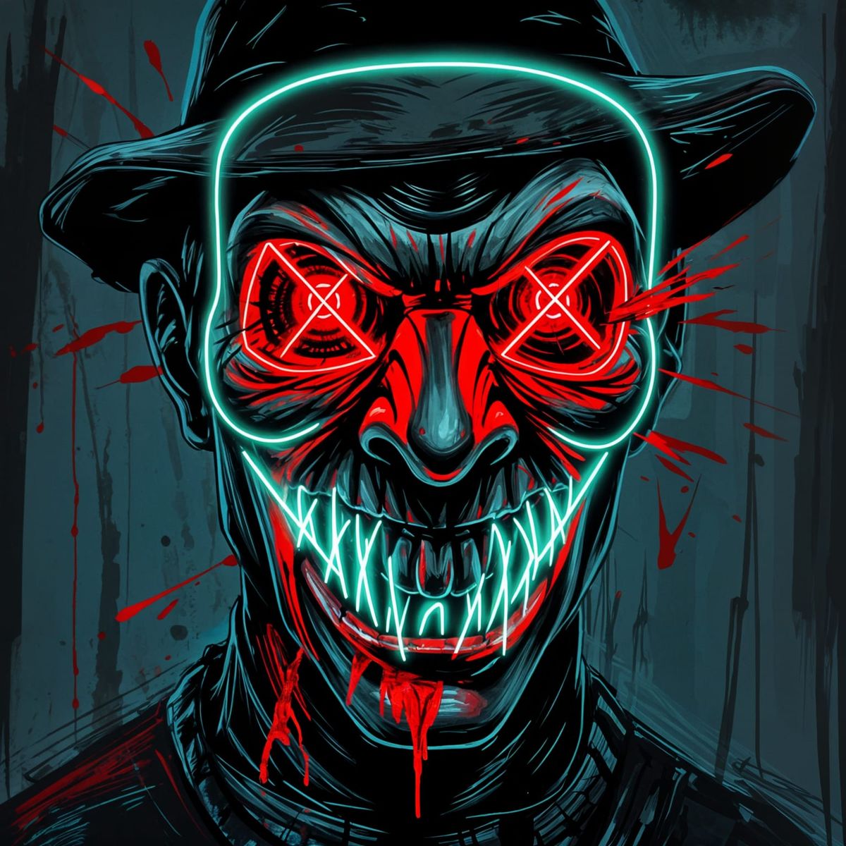 This image shows a distorted portrait of Freddy Krueger with red and black brushstrokes. The chaotic artwork features a glowing neon mask with crossed-out eyes and a wide grin in thick, fluorescent strokes.