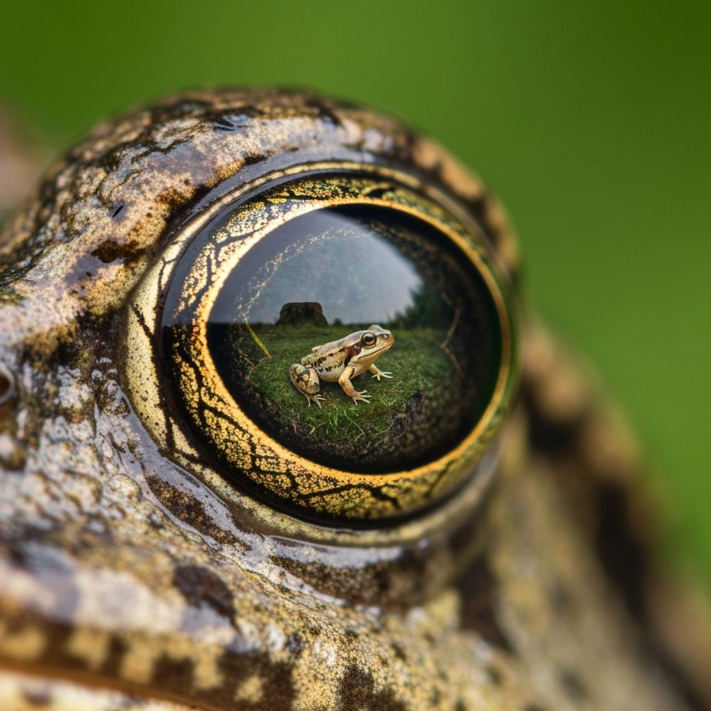 Extreme close-up macro photography of a frog's eye reflecting a tiny, detailed frog in its pupil. Shallow depth of field with bokeh background, showcasing vivid natural colors and textures.