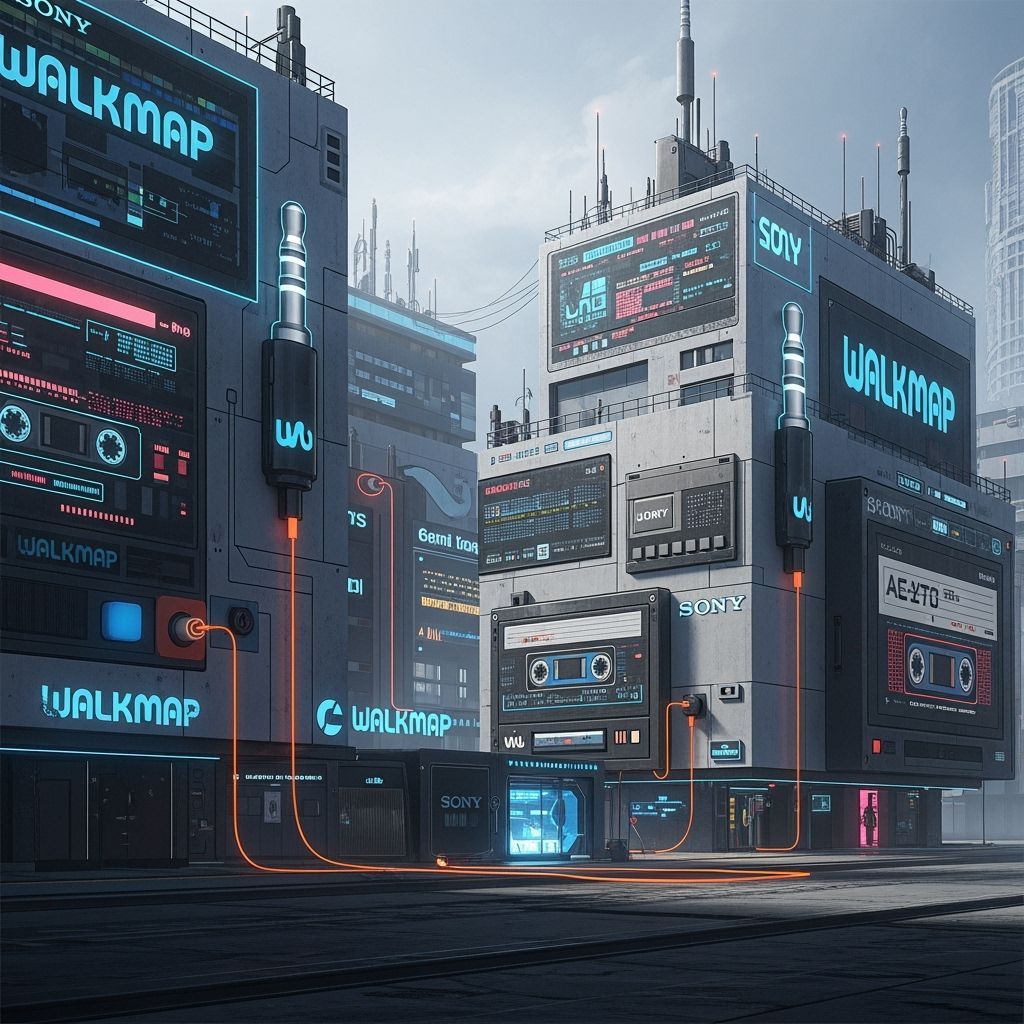 A surreal architectural concept artwork featuring brutalist buildings with futuristic lines, neon lights, and integrated Sony Walkman design elements. Set in a dystopian landscape.