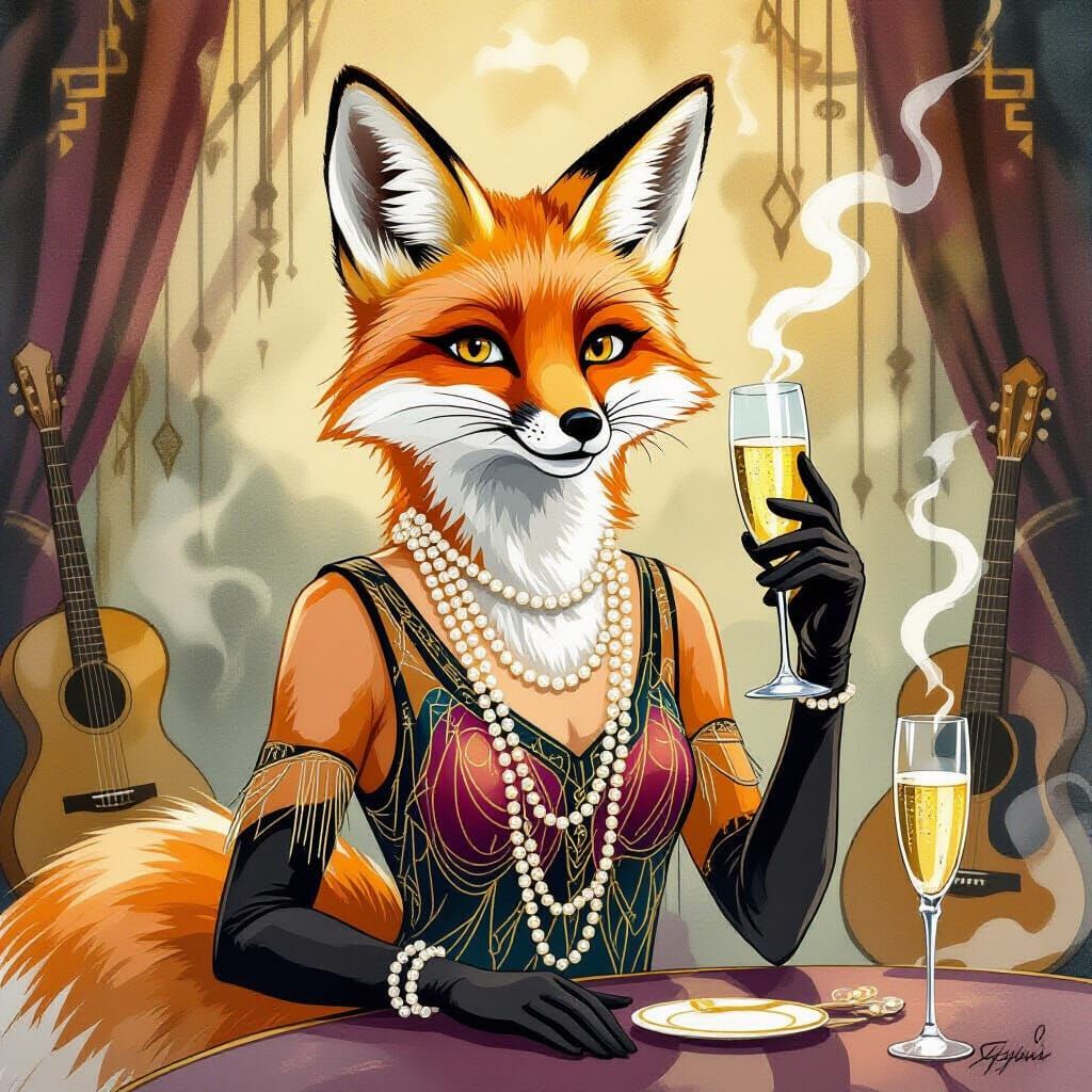 A vintage-style image of a fox in a flapper dress drinking champagne in a jazz club. The artwork is reminiscent of early 20th-century illustration with art deco elements.