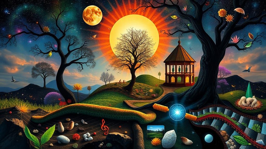 This 8K digital artwork combines bio-art and glowing elements, reflecting the artist's connection with nature and the cosmos. The piece features vibrant absorption spectra, symbolizing the harmony between earth and sky.