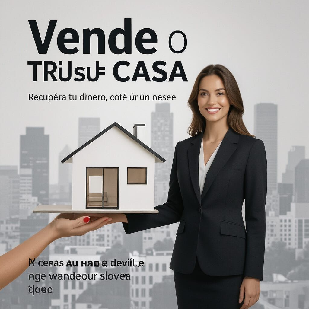 This image showcases a businesswoman holding a minimalist house adorned with a red bow, set against a blurred urban backdrop. The design incorporates clean, modern typography and a vibrant color scheme of white, black, and red.