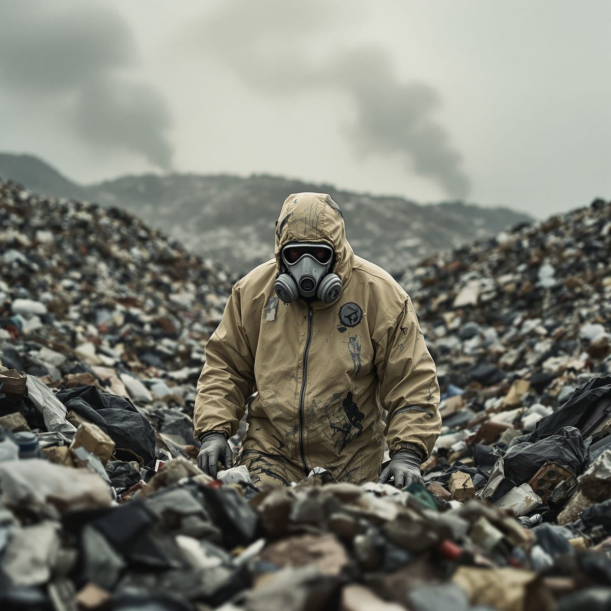 This image shows a solitary figure in a hazmat suit scavenging in a sprawling landfill under a polluted sky. The artwork features gritty realism with stark details and a muted color palette.