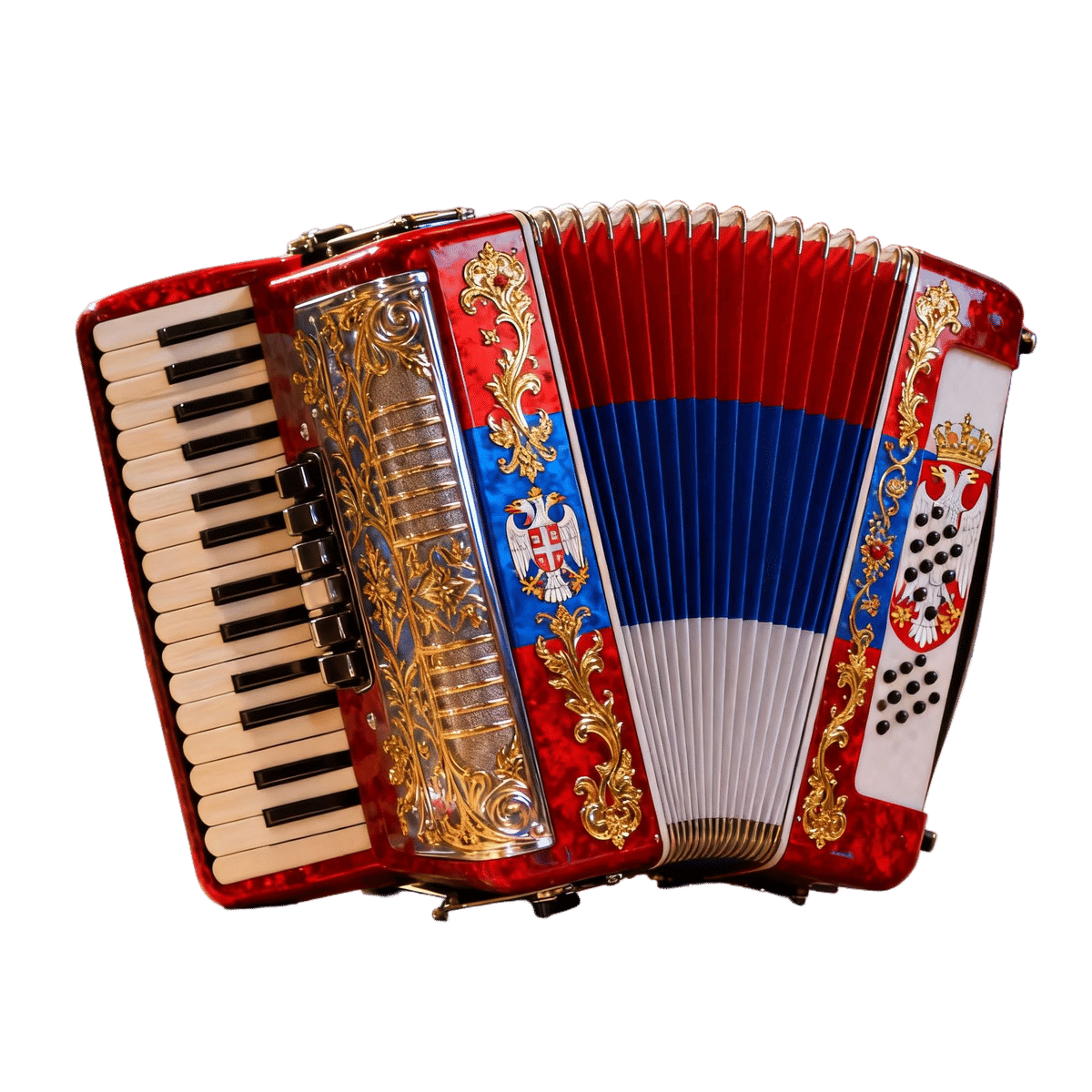 This photorealistic image showcases a classic piano accordion with striking red, blue, and gold colors. It features gleaming metallic details against a festive background, rendered in a modern poster style with cinematic lighting.