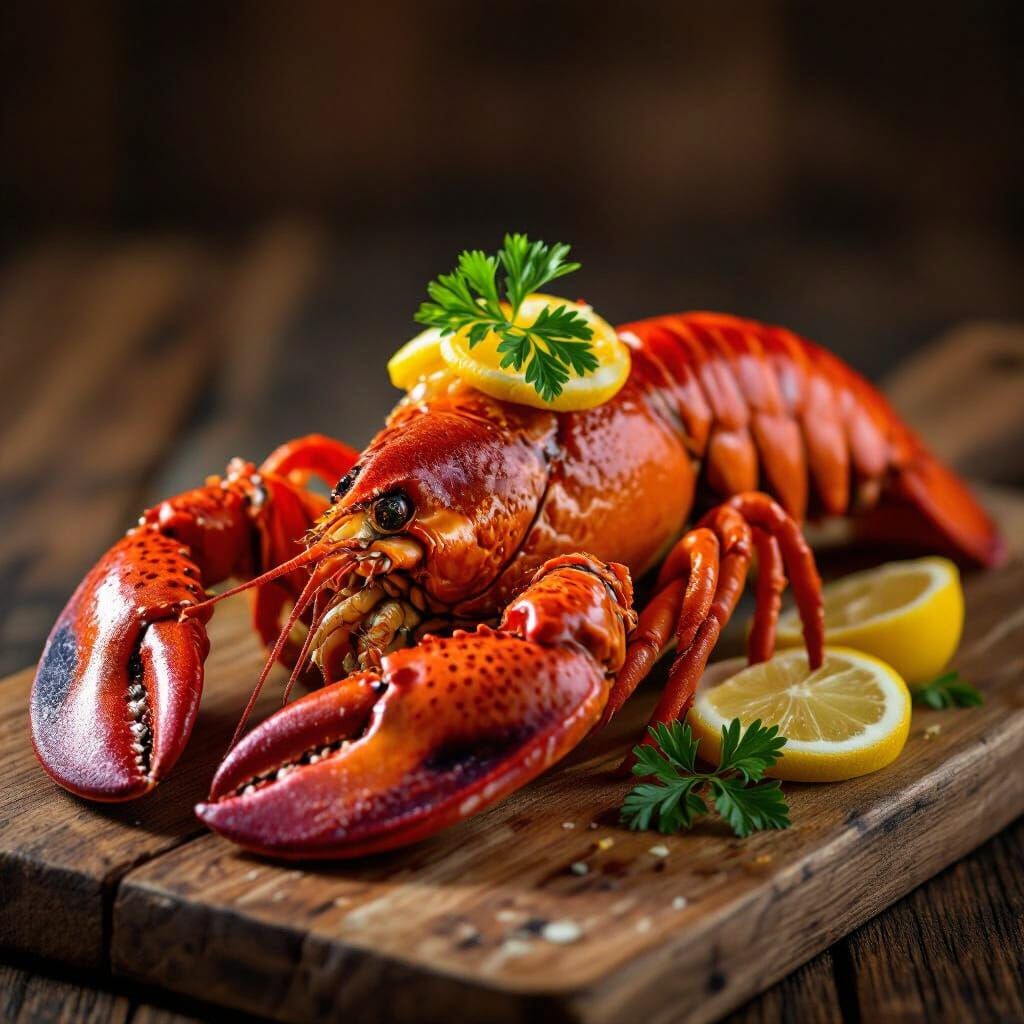 This photorealistic image showcases a vibrant red Maine lobster, detailed with a lemon and parsley garnish on a wooden board. Soft lighting and a macro lens highlight its appetizing texture.