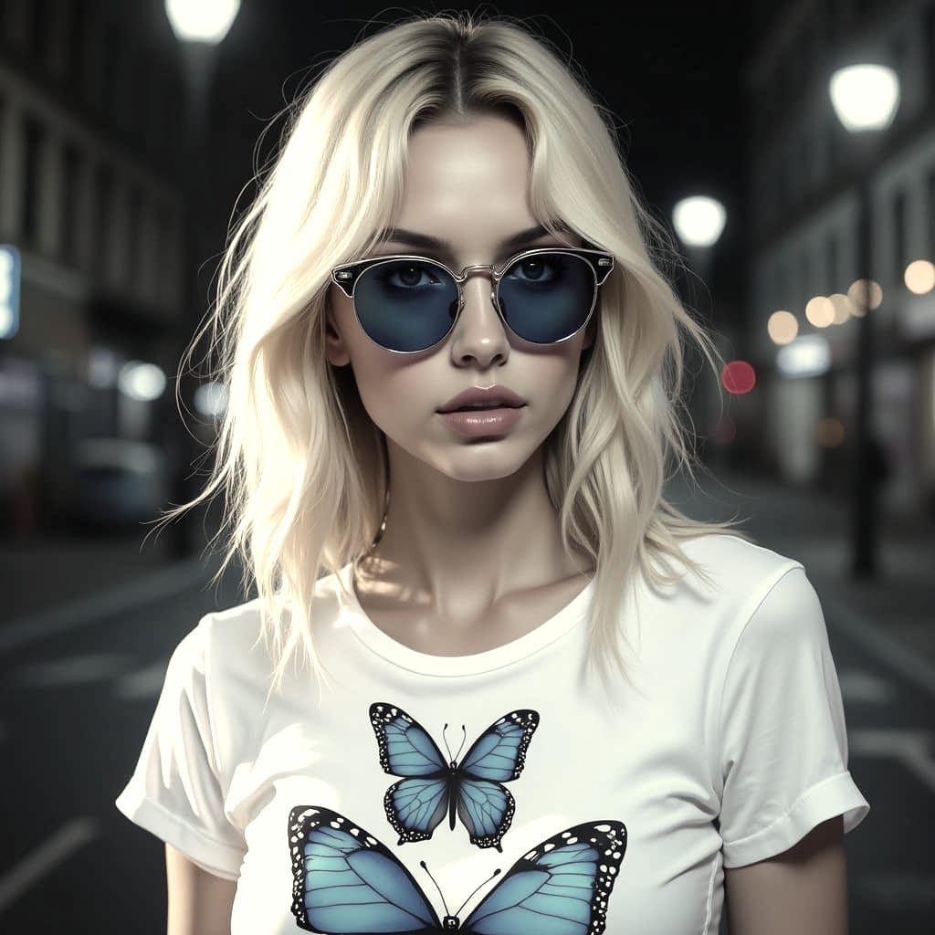 This striking black and white portrait of a blonde woman embodies the classic film noir aesthetic, with dramatic lighting, deep shadows, and a confident, mysterious smile. Her elegant expression and subtle style are captured in high-contrast detail, evoking the timeless cinematic look of the genre.