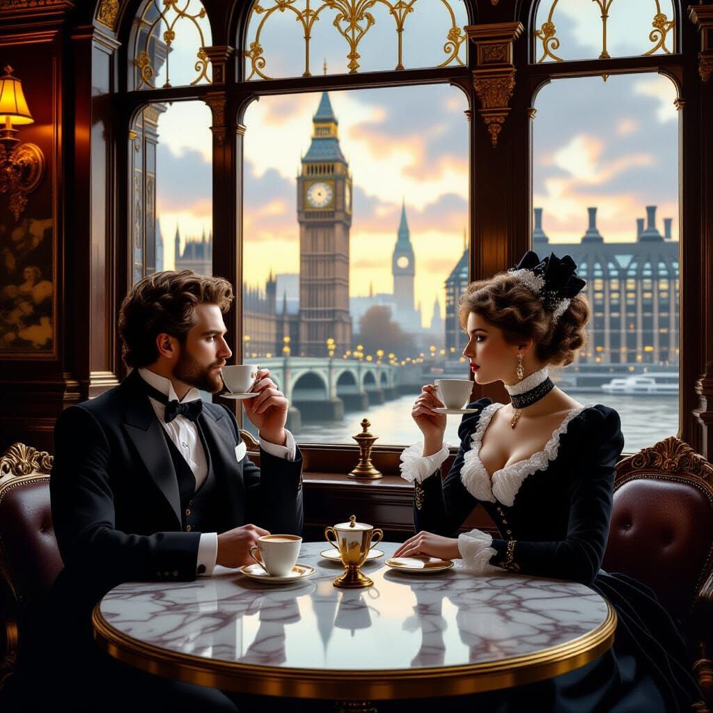 This image depicts a photorealistic Victorian London cafe with a couple in formal attire enjoying coffee amidst surreal temporal distortions, rendered in a classical composition with warm, idealized lighting.