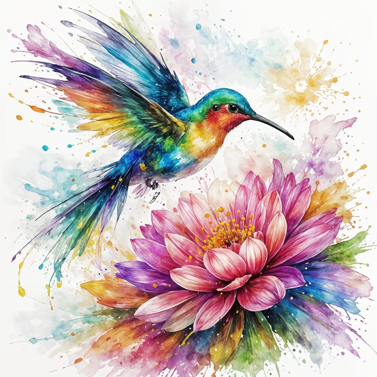 Easily generate your own colorful, abstract ink splash artworks of hummingbirds and flowers for free.