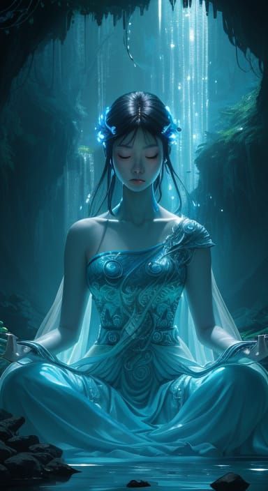 This image shows a blue-skinned woman meditating peacefully near a waterfall. The digital painting features bioluminescent details and a hyper-realistic aesthetic, reminiscent of concept art.