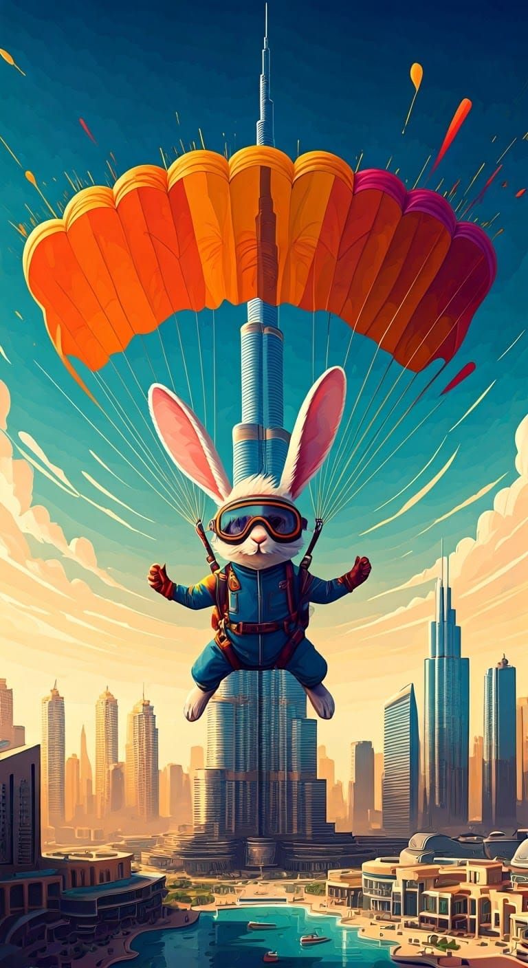 This image shows a rabbit in a colorful jumpsuit parachuting away from a massive skyscraper, in a dynamic and stylized illustration with vibrant colors and loose brushstrokes, reminiscent of futuristic and sci-fi art