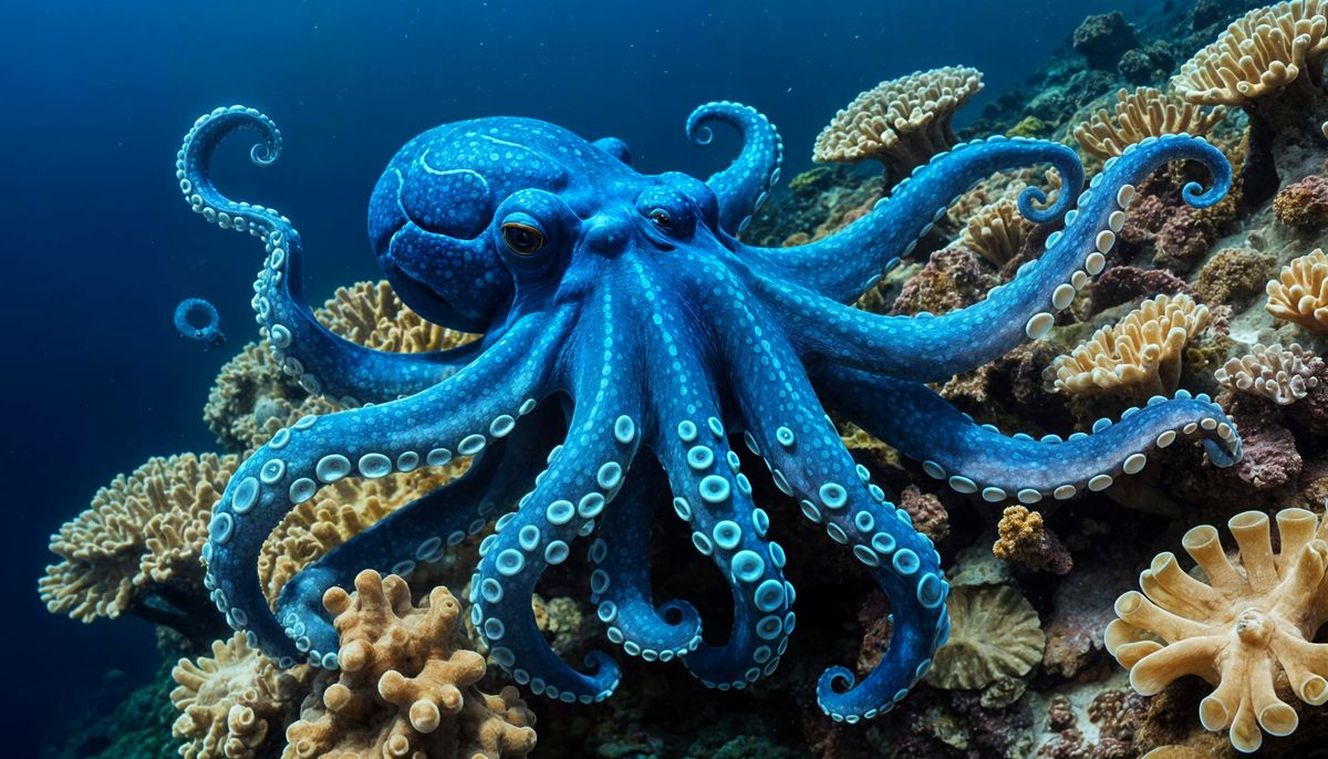 This image shows a vibrant blue octopus in its natural habitat. The deep ocean scene is rich with color, creating a visually striking and captivating underwater view.