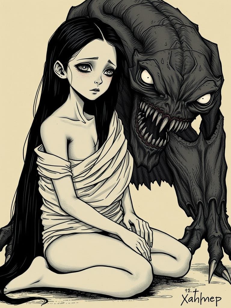 This image shows a sorrowful young woman kneeling next to a large, grotesque monster. The artwork features detailed cross-hatching and stippling in a dark, gothic style.