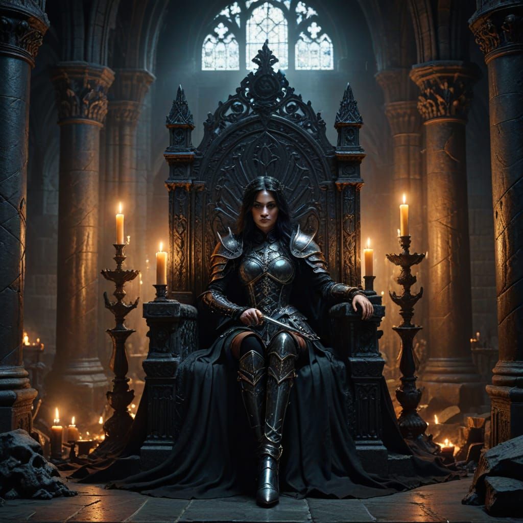 This image is a photorealistic depiction of a powerful woman sitting on an ornate throne in a gothic cathedral, surrounded by medieval armor, intricate textures, and dramatic lighting, evoking a sense of mystery and regality.