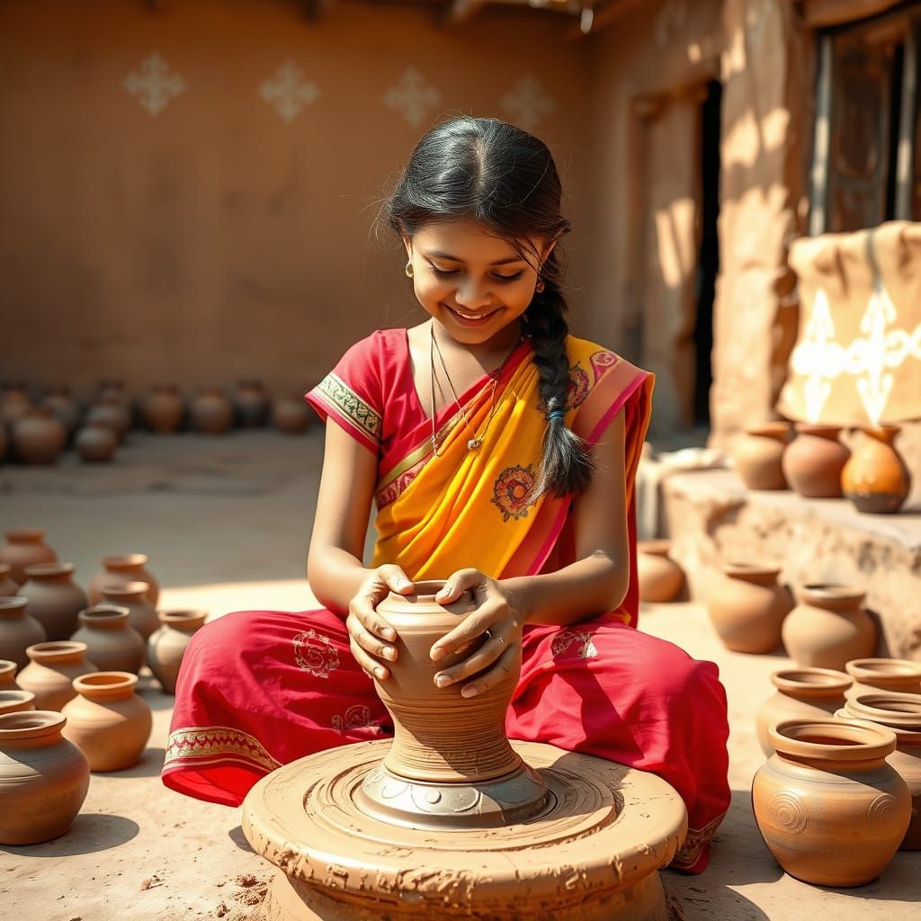 This image shows a village girl crafting pottery. She's wearing a colorful saree and sitting in the sunlit courtyard of her mud house, shaping clay on a potter's wheel in an ultra-realistic photography style.