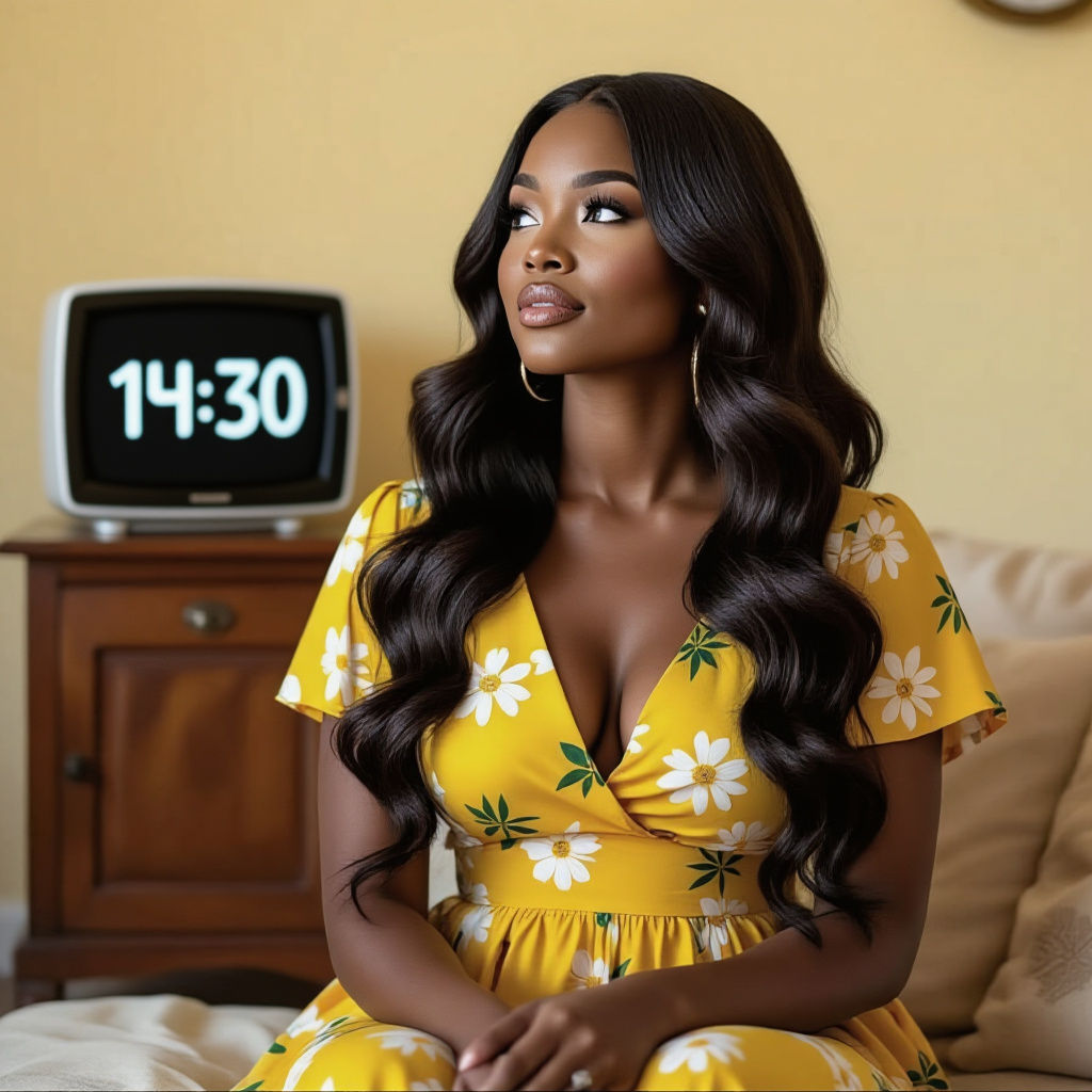 This image shows a beautiful African woman in a yellow summer dress looking up at the ceiling in a cozy living room. The scene is reminiscent of a vintage photograph with a warm, inviting atmosphere.