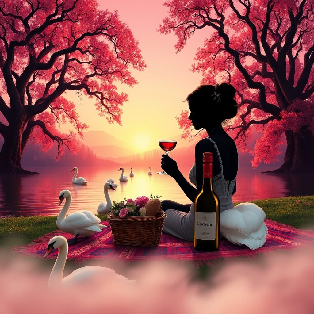 In the foreground, a serene lake scene at sunset, majestic swans glide across the lake's surface, their feathers glistening with dew. Towering trees, their leaves ablaze with hues of pink, purple, and gold, stretch towards the sky, framing the serene atmosphere with their gnarled, twisted branches. In ...