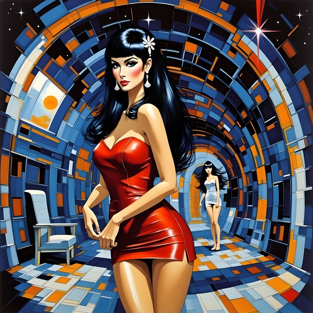 A futuristic space station corridor serves as the backdrop for a striking Asian woman, dressed in a vibrant red qipao, with elaborate hair and ornate earrings, illuminated by a crescent moon, amidst a swirling galaxy of stars, planets, and spaceships.