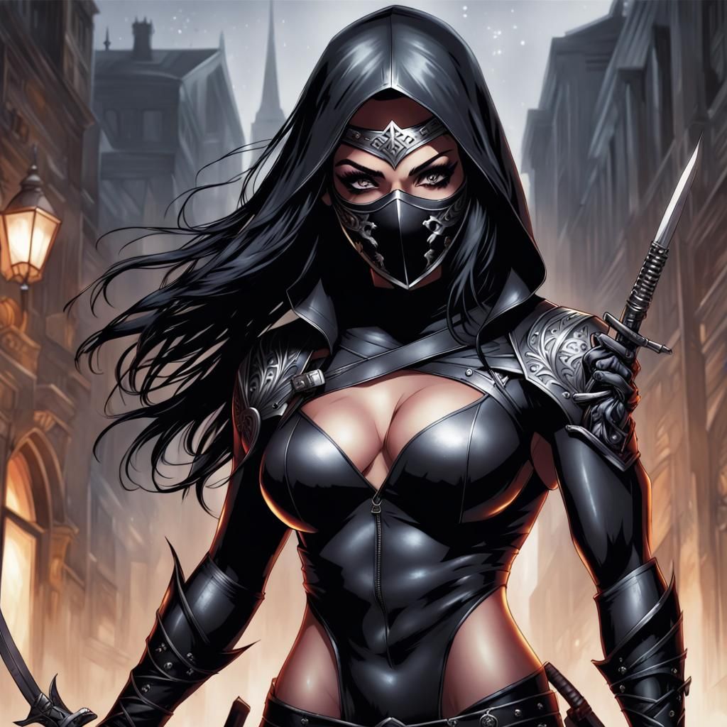 A striking picture of a muscular female assassin in a black metal outfit. This comic book art style image features smooth lines and a masked figure.