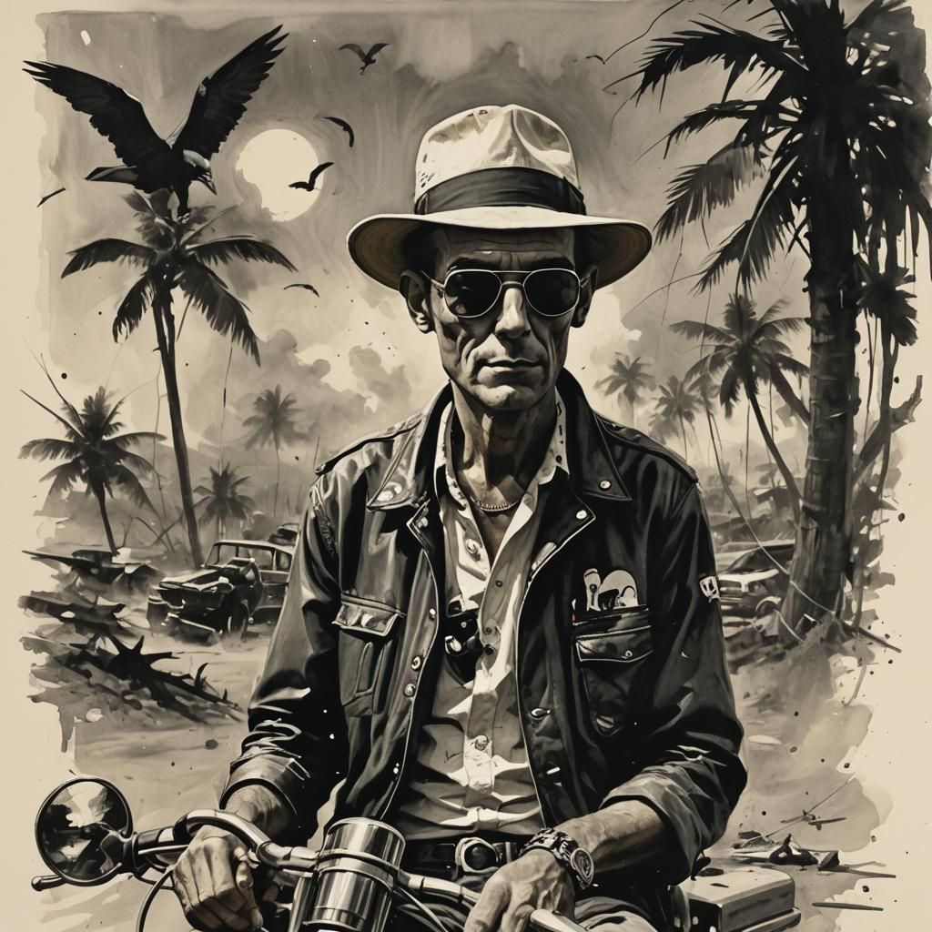A sinister portrait of Hunter S. Thompson. The image captures a dark and ominous atmosphere, emphasizing the subject's intensity. The artwork is reminiscent of digital painting styles.