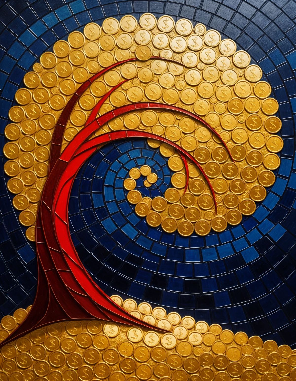 This image showcases a vibrant impasto painting of a tree laden with gold coins. The textured artwork features a warm glow against a dark, mosaic-like background, creating a magical feel.