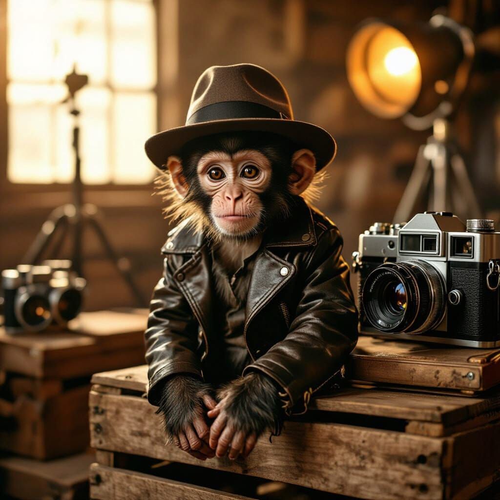This image shows an adorable young monkey dressed in a fedora and leather jacket, seated with vintage cameras. Captured with a grainy, sepia-toned film aesthetic, it resembles a cinematic still.