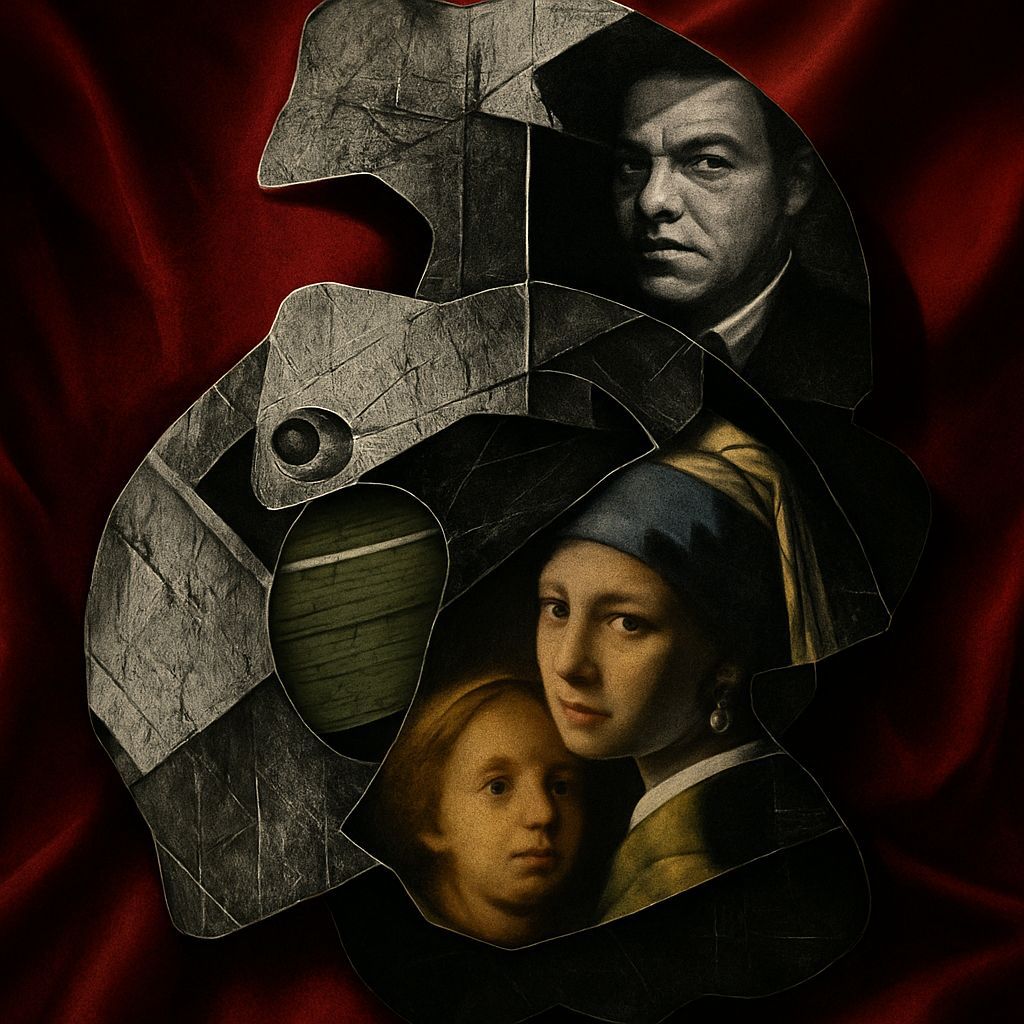 A surreal digital collage reminiscent of M.C. Escher and Victor Vasarely, featuring gothic spinning elements. The artwork has a noir aesthetic with a red silk background.