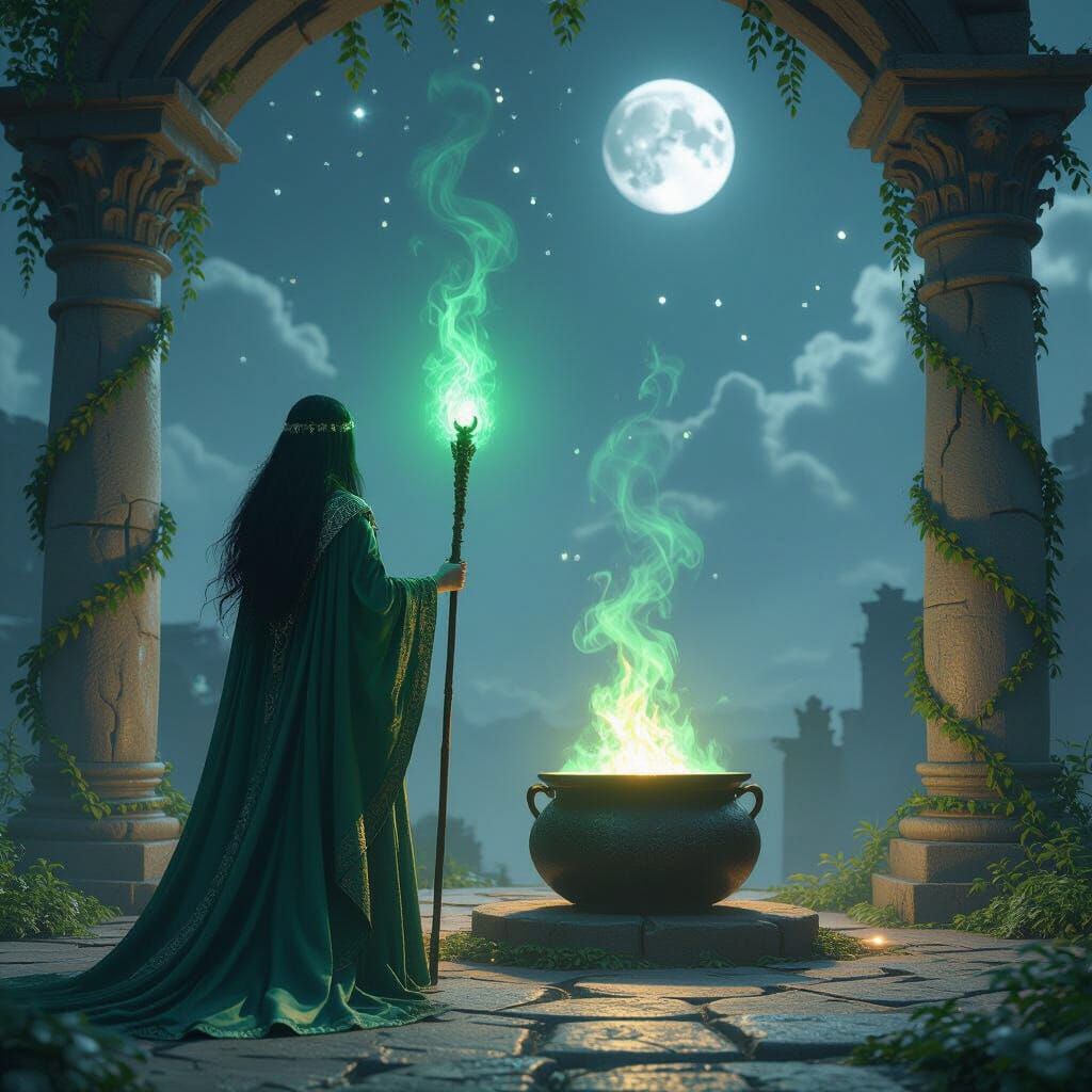 A dark-haired goddess in an emerald robe holds a staff, glowing before a vine-covered stone temple. A fiery cauldron releases green steam under a starry sky and black moon, presented with epic 3D game graphics.
