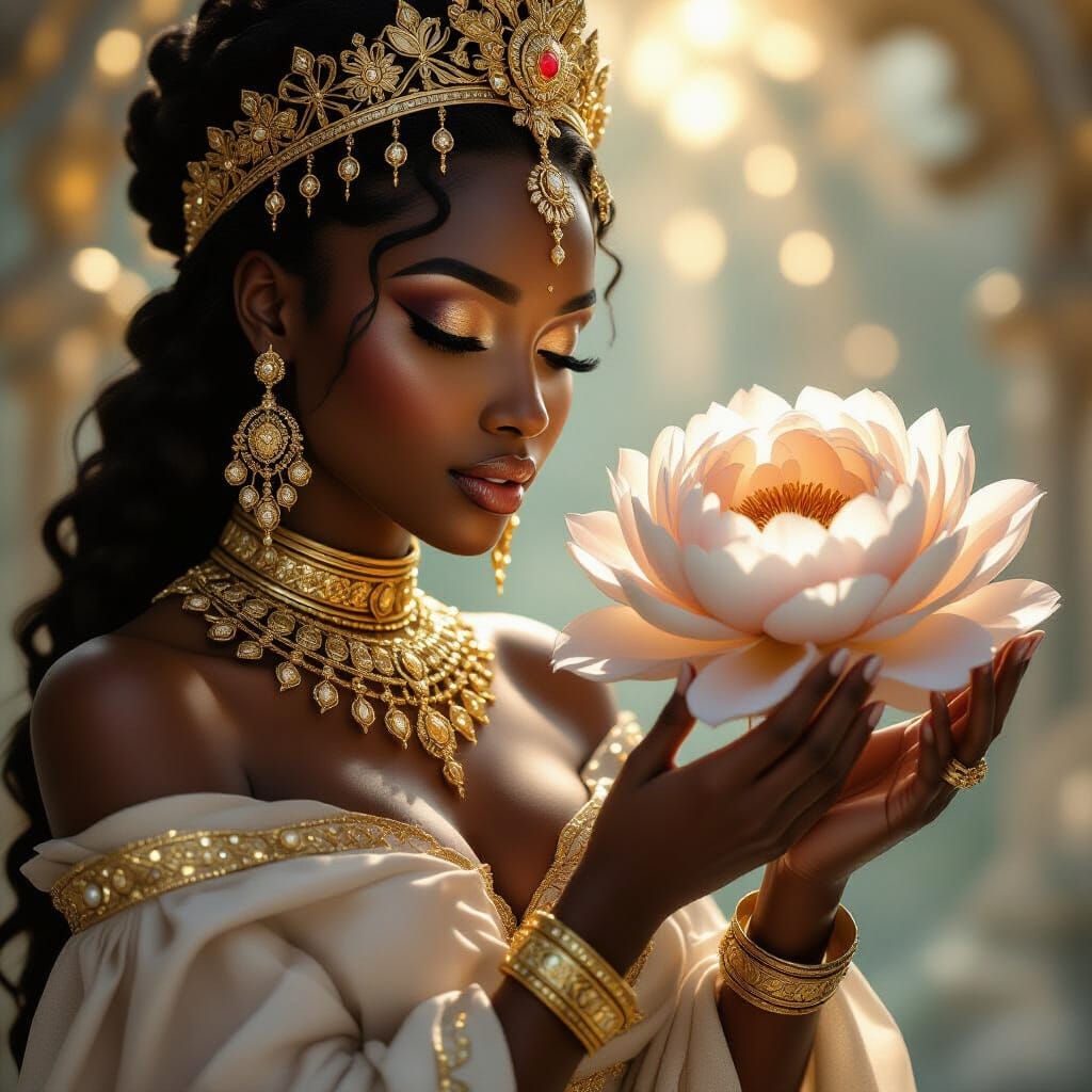 This hyperrealistic digital artwork features a regal African goddess with glowing skin and intricate gold jewelry, holding a delicate paper peony sculpture. Soft lighting enhances opulent textures.