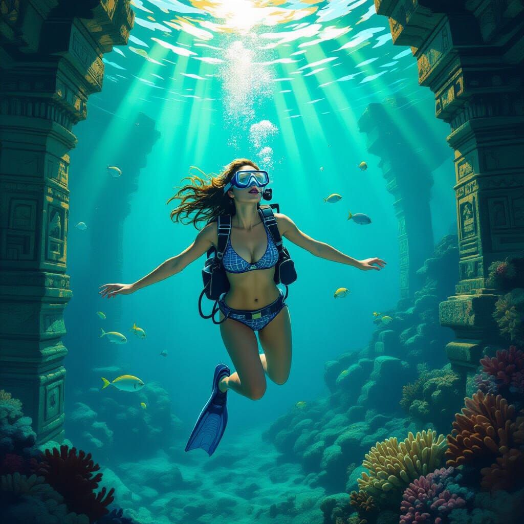 A striking picture of an actress playing an archeologist exploring an underwater temple. She's surrounded by coral and fish in this vibrant digital painting, reminiscent of an archeological magazine cover.