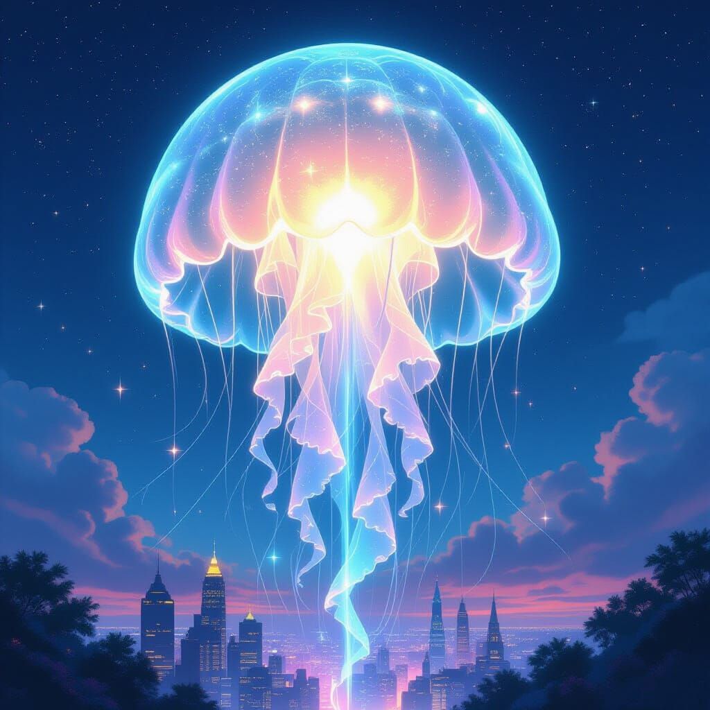 A colossal, radiant jellyfish made of starlight drifts in the night sky, illuminating a city below with ethereal bioluminescence. Dreamlike magical realism with vibrant colors.
