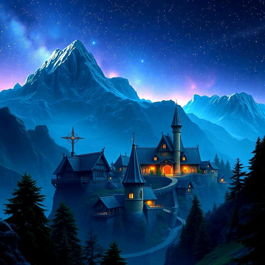 A breathtaking fantasy village nestled in the mountains under a starry night sky, with intricate details and deep colors, as seen in concept art for Unreal Engine 5.