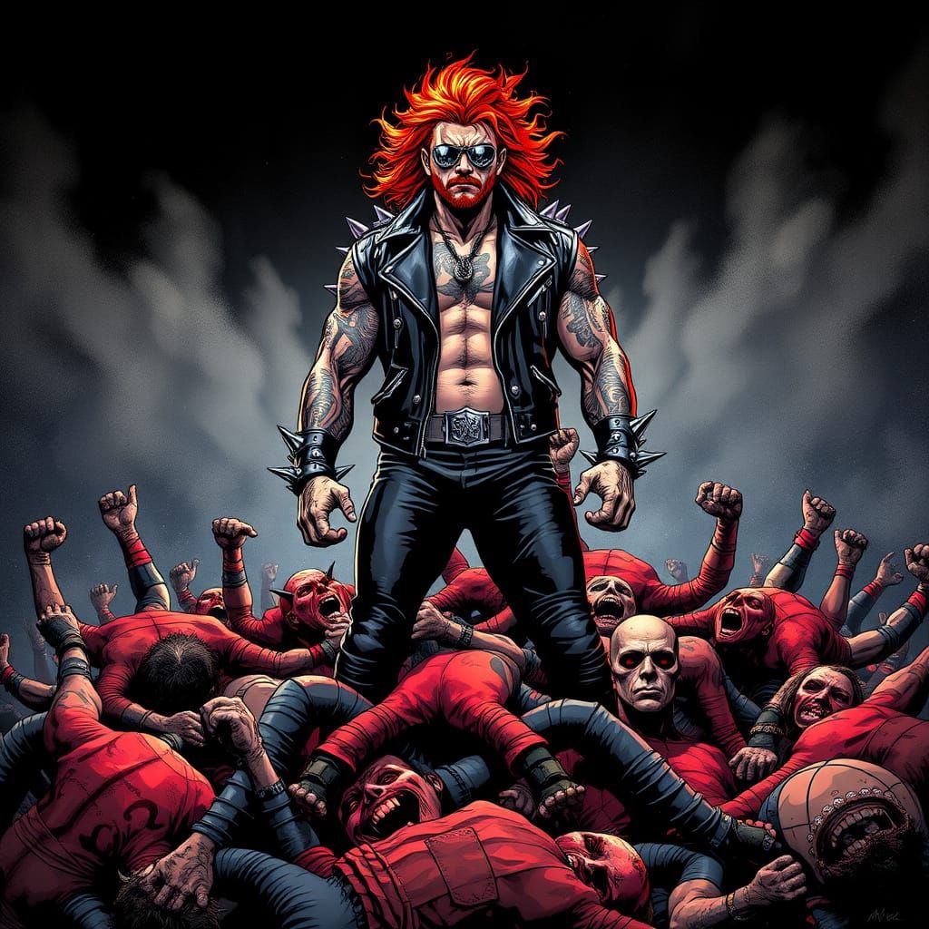 A powerful figure stands victorious atop a mountain of defeated foes, his fiery red hair ablaze and tribal tattoos a testament to his unyielding strength. Set in a gritty, high-contrast world of dark futurism and film noir inspiration.