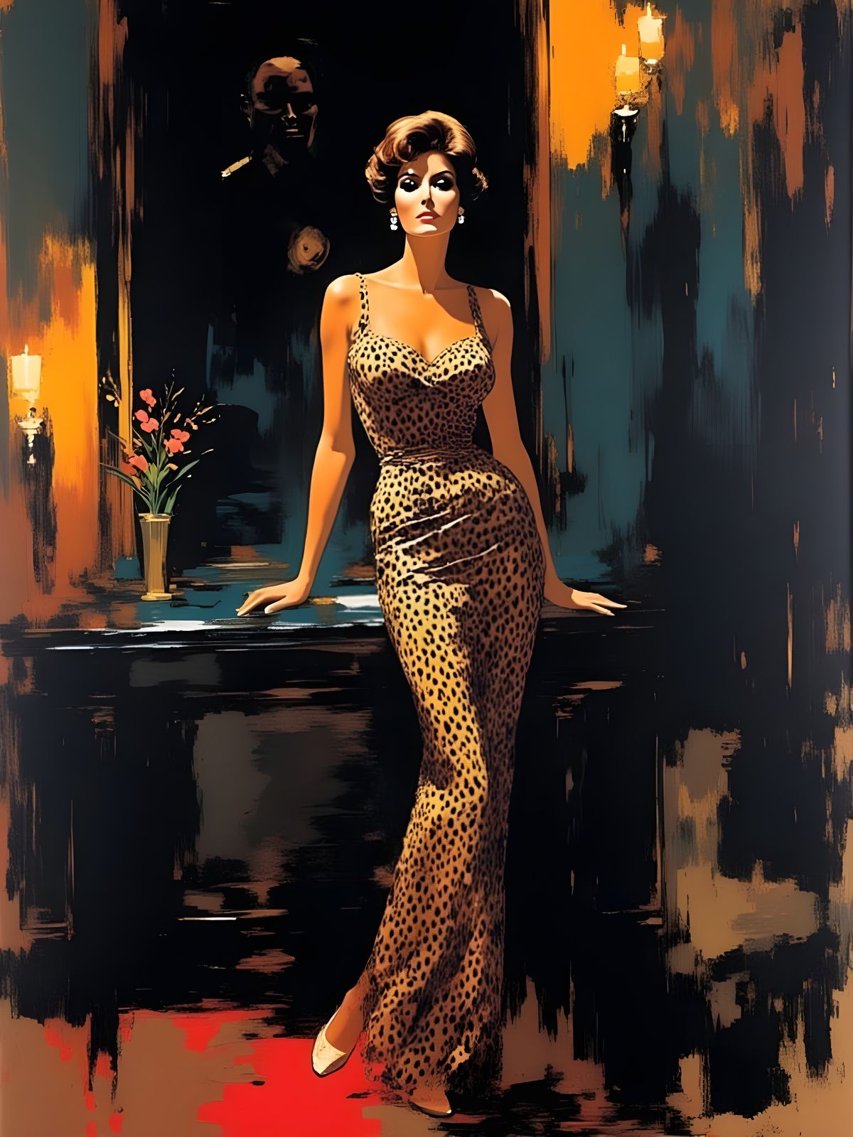 This image shows Sophia Loren in a dramatic pose wearing a cheetah print dress, rendered in a vivid, high-contrast abstract expressionist style with moody lighting.