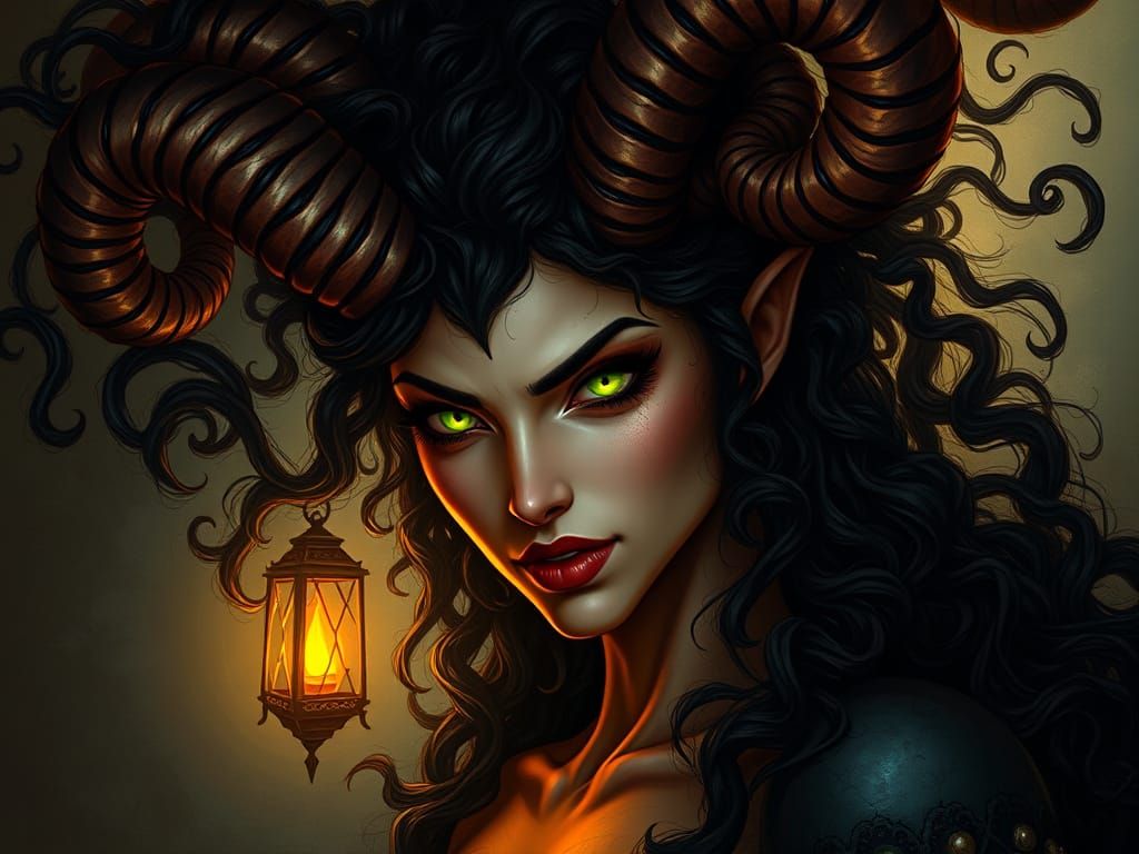 This image shows a powerful demoness with long, twisted horns and bright green glowing eyes, set against a backdrop of deep, rich colors that seem to pulse with life. Her wild, curly hair and warm, golden skin evoke a sense of intense, barely-contained power, as if she's radiating an aura of energy and m...