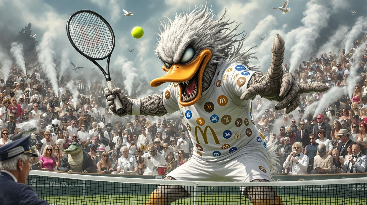This image depicts a grotesque caricature of a Donald Duck-like monster playing tennis. The bizarre background includes a crowd of assorted characters and unusual details in a chaotic scene.