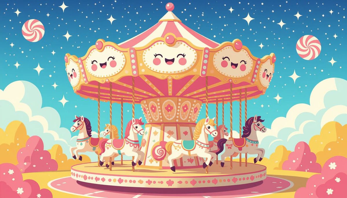 A surreal carousel featuring giant macarons and éclairs as whimsical figures, built from gingerbread and spun sugar. Set against a vibrant, starry candy-floss sky in a playful, flat vector art style.